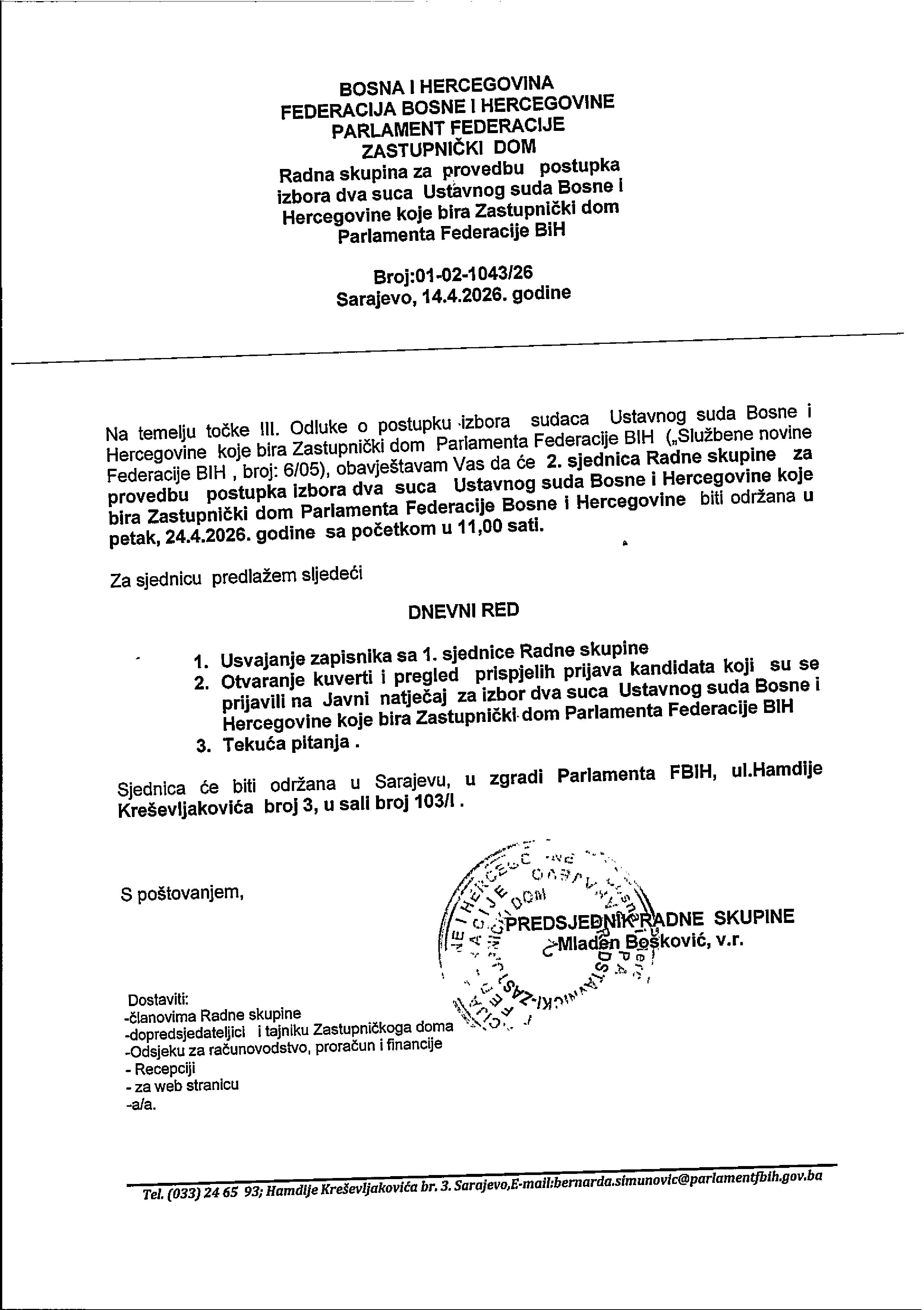 Poziv za 2. sjednicu Radne skupine za provedbu postupka izbora dva suca Ustavnog suda BiH koje bira Zastupnički dom Parlamenta FBiH 15.04.2026 Najave HR